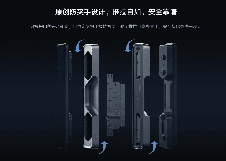 小米智能門鎖M20 采用高強度合金中框與一體化IML 工藝完美契合,正面黑晶面板上的隱形觸控按鍵和指示燈,讓整個門鎖渾然一體。無論是正面還是側面,M20 將小米的簡約風格做到了極致。創(chuàng)新地采用了單邊內凹防夾手把手設計,可根據(jù)門的開合朝向,自定義把手的握持方向,避免推拉門意外夾手。