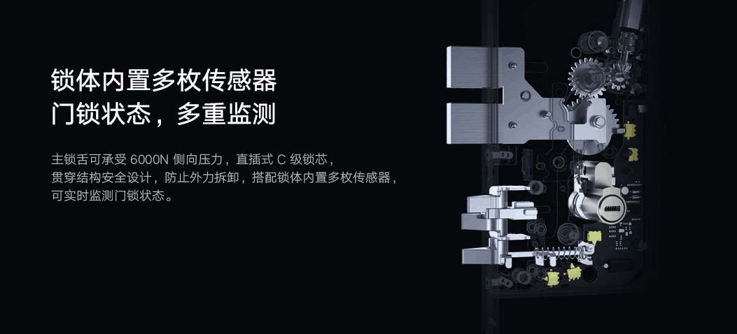 該門鎖全自動鎖體內搭載動力系統(tǒng),驗證通過后,主鎖舌快速收回,推拉把手即可開門,離家關門自動上鎖。主鎖舌可承受6000N 側向外力,直插式C 級鎖芯,貫穿結構安全設計,防止外力拆卸。