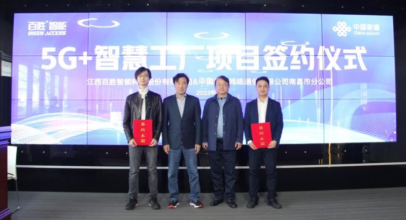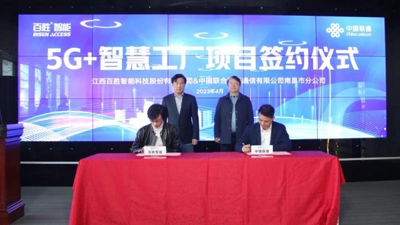 隨后,中國(guó)聯(lián)通南昌縣分公司總經(jīng)理胡凱敏和江西百勝智能科技股份有限公司副總經(jīng)理劉子堯分別代表雙方簽署協(xié)議,宣告百勝“5G+智慧工廠”項(xiàng)目正式啟動(dòng)!劉潤(rùn)根董事長(zhǎng)、韓智洪總經(jīng)理一同見(jiàn)證了這一重要時(shí)刻。