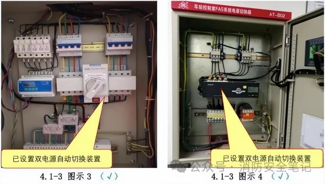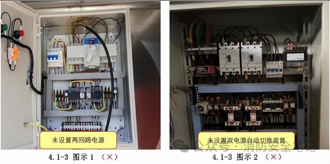 問題描述: 消防控制室、消防水泵房、防煙和排煙風機房的消防用電設(shè)備及消防電梯等的供電,未在其配電線路的最末一級配電箱處設(shè)置兩回路電源或未設(shè)置自動切換裝置(負荷等級為三級的消防設(shè)備除外)【圖示1]【圖示2]