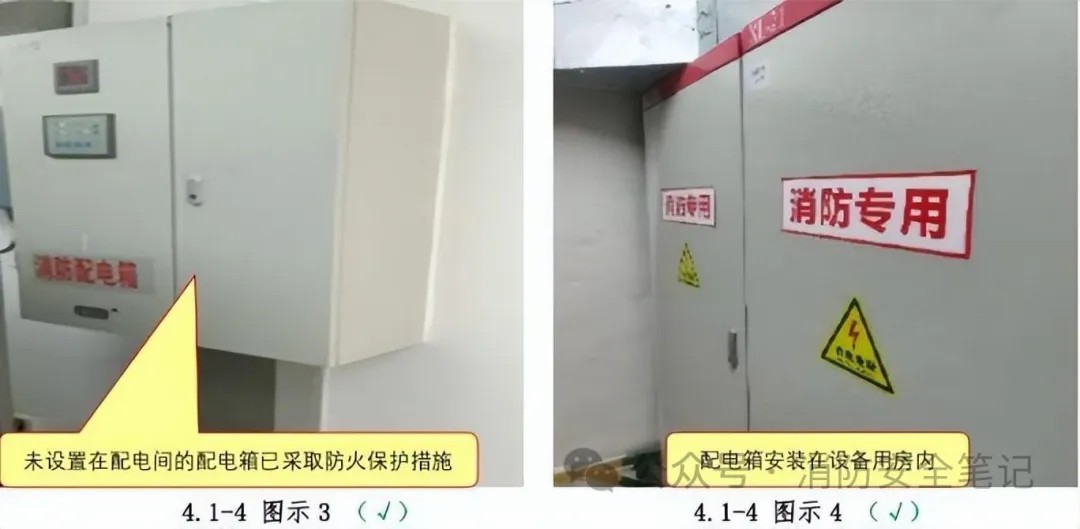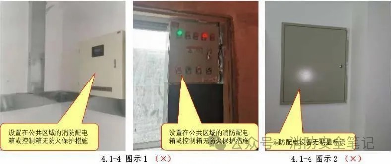 問題描述: 1)按一、二級負荷供電的消防設(shè)備,其配電箱未獨立設(shè)置;[圖示1]2) 設(shè)置在公共區(qū)域的消防設(shè)備配電箱或控制箱無防火保護措施;【圖示1]3)消防配電設(shè)備未設(shè)置明顯標志。【圖示2]