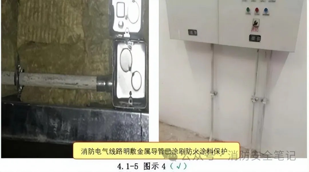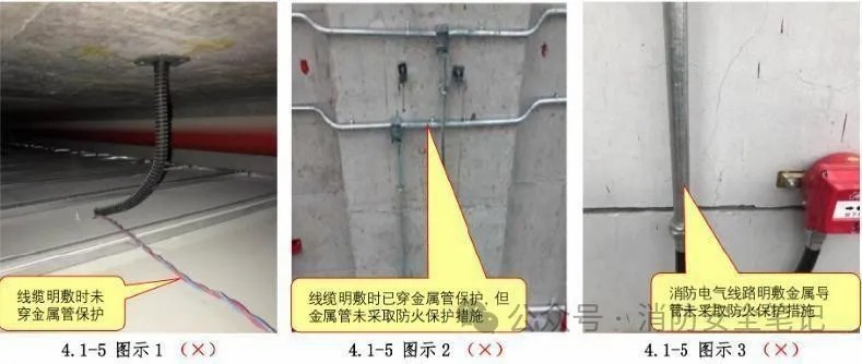 問題描述: 1)消防配電線纜明敷時未穿管(或已穿管但非金屬管)保護【圖示1];2)金屬導管或封閉式金屬槽盒未采取防火保護措施(當采用阻燃或耐火電纜并敷設(shè)在電纜井、溝內(nèi)時以及采用礦物絕緣類不燃性電纜除外)【圖示2]【圖示3];3)暗敷在不燃性結(jié)構(gòu)層內(nèi)時保護層厚度未達到30mm 要求。