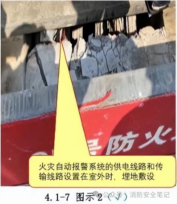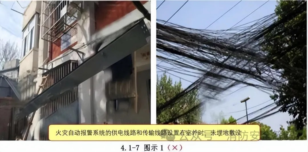 問題描述: 火災自動報警系統(tǒng)的配電線路與傳輸線路設(shè)置在室外時,未埋地敷設(shè),不符合規(guī)范要求?!緢D示1]
