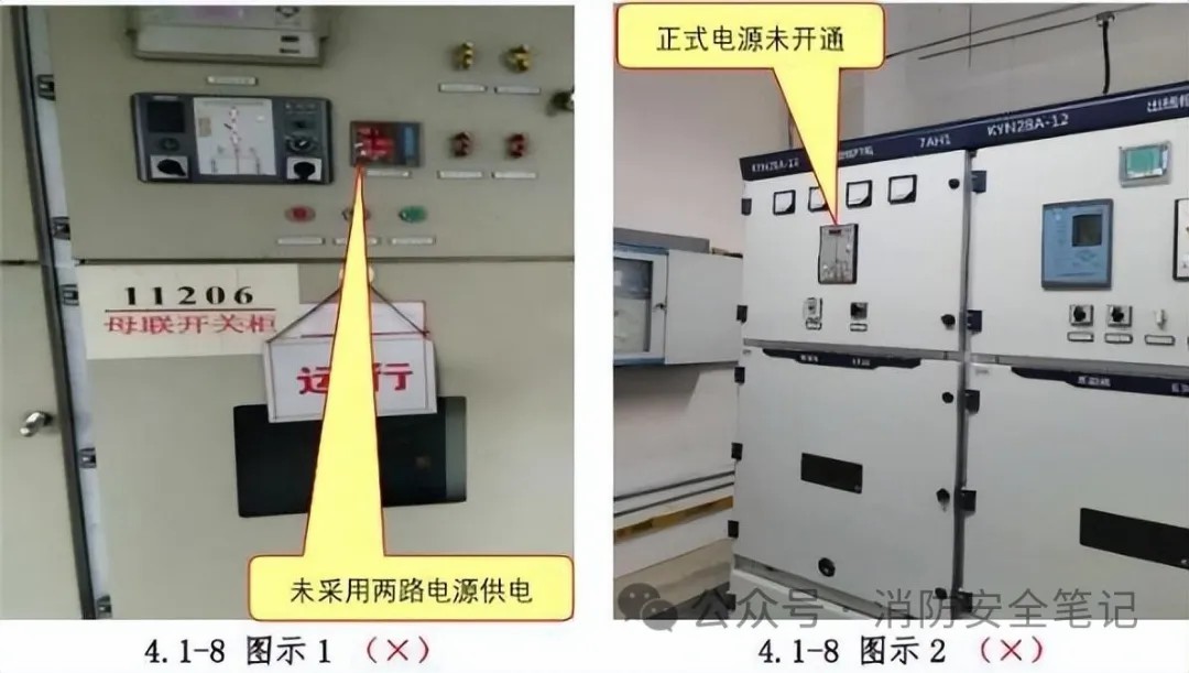 原因分析: 1)設(shè)計單位未根據(jù)消防用電應按一級負荷供電的要求,制訂相應的供配電方案,造成電源設(shè)置不符合規(guī)范要求;2)項目實施過程中,責任主體的工作未按工期計劃完成;3)項目規(guī)劃、實施過程未能與當?shù)毓╇姴块T溝通協(xié)調(diào)好,工程竣工驗收時還不具備一級負荷供電的要求。;相關(guān)規(guī)范: ☆《供配電系統(tǒng)設(shè)計規(guī)范》(GB50052-2009)第3.0.2條?!緢D示3]【圖示4]☆《建筑電氣與智能化通用規(guī)范》(GB55024-2022)第3.1.2條。正確做法: