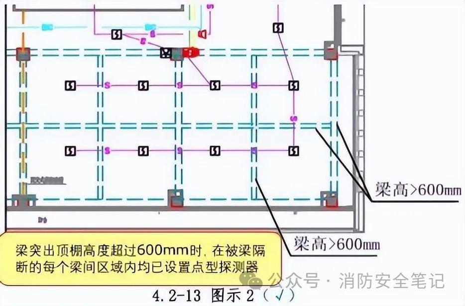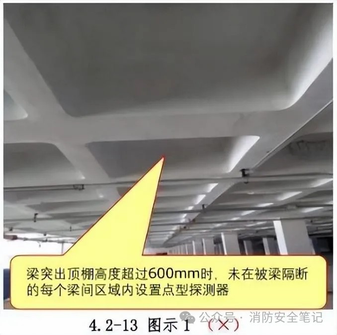 問題描述: 1)在有梁的頂棚上設(shè)置點型火災探測器時,未考慮梁的影響因素;2)當梁突出頂棚的高度超過600mm時,被梁隔斷的每個梁間區(qū)域未設(shè)置點型探測器。【圖示1]。