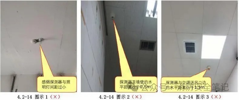 問題描述: 現(xiàn)場點型探測器設(shè)置不符合規(guī)范要求的有:1)點型探測器與照明燈間距過小【圖示1];2) 點型探測器至墻壁的水平距離小于0.5m[圖示2]:3)點型探測器距空調(diào)送風口邊的水平距離小于1.5m[圖示3]。