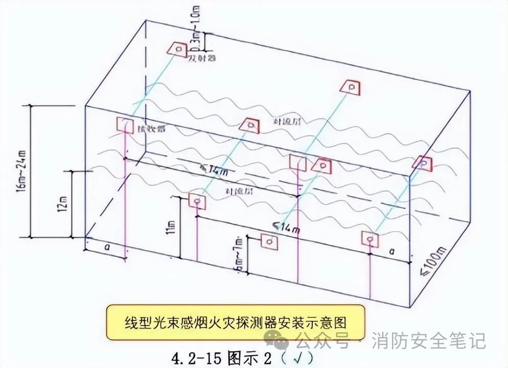 措施: 1.當頂棚高度不大于5m時,探測器的紅外光束軸線至頂棚的垂直距離為0.3m;當頂棚高度為10m~20m時,光束軸線至頂棚的垂直距離口為1.0m ;2.相鄰兩組線型光束感煙火災探測器的水平距離不應大于14m。探測器至側(cè)墻水平距離不應大于7m且不應小于0.5m。探測器的發(fā)射器和接收器之間的距離不宜超過100m;3.采用分層組網(wǎng)的探測方式,除按原規(guī)范規(guī)定設(shè)置在建筑頂部外,在建筑高度不超過16m時,在6m~7m處增設(shè)探測器;在建筑高度超過16m但不超過26m時,在6m~7m 和11m~12m 處各增設(shè)一層探測器。 |