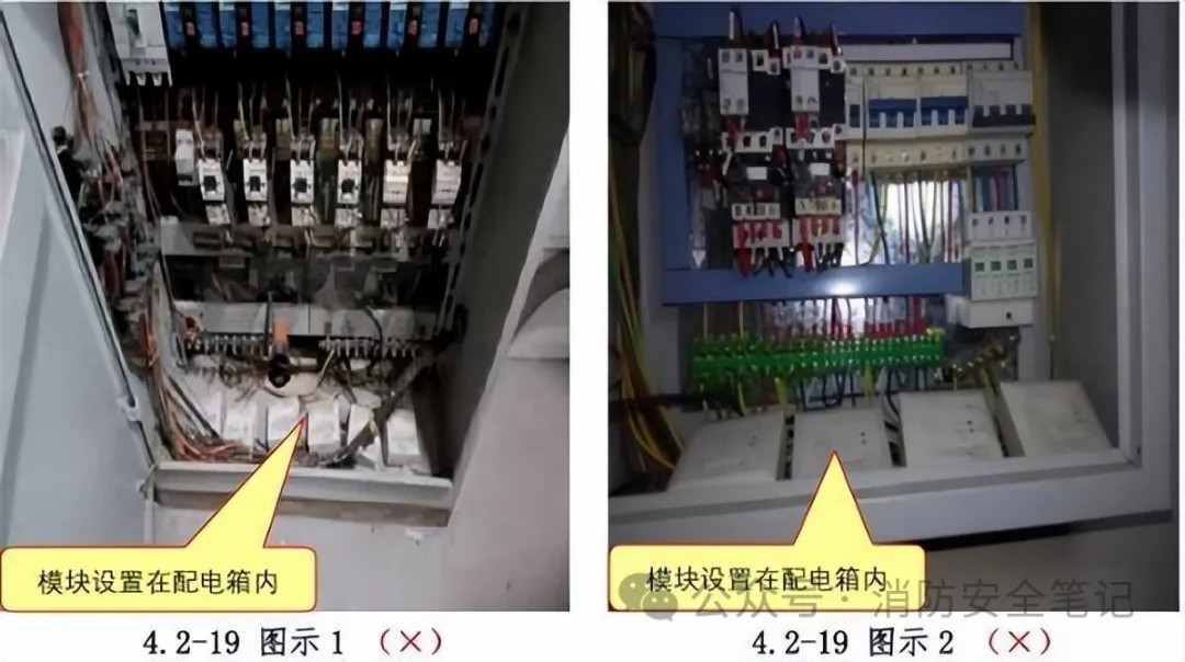 原因分析: 1)設(shè)計圖紙未設(shè)置模塊箱,施工單位圖省事直接將模塊設(shè)置在配電(控制)柜(箱)內(nèi);2)責任主體未認識到模塊設(shè)置在配電(控制)柜(箱)內(nèi)的潛在危險性,在施工過程中圖方便、節(jié)約成本,直接放在配電箱中。相關(guān)規(guī)范: ☆《火災自動報警系統(tǒng)設(shè)計規(guī)范》(GB50116-2013)第6.8.1條、第6.8.2條?!緢D示3]【圖示4]。正確做法: