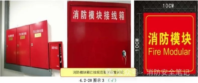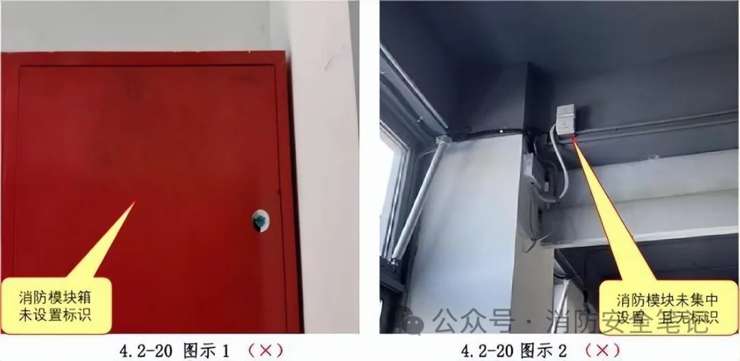 問題描述: 消防模塊或模塊箱未按規(guī)定設(shè)置標識,不便于后期消防人員維修查找。【圖示1]【圖示2】。