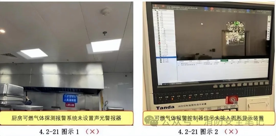 問題描述: 1)廚房(不包括住宅建筑內(nèi)的廚房)可燃氣體探測報警系統(tǒng)未設(shè)置火災聲光警報器;【圖示1)2)可燃氣體探測器直接接入火災報警控制器的探測器回路;3)可燃氣體報警控制器的報警和故障信息,未在消防控制室圖形顯示裝置顯示?!緢D示2]。