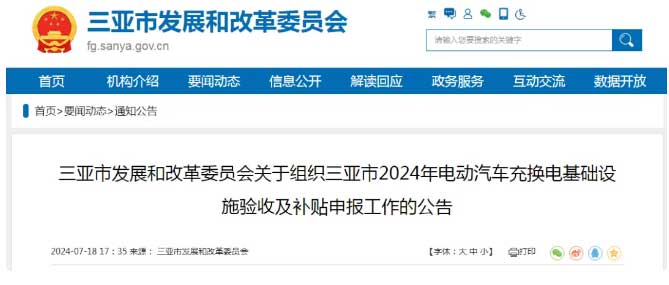 2024年7月18日,三亞市發(fā)展和改革委員會(huì)公布關(guān)于組織三亞市2024年電動(dòng)汽車充換電基礎(chǔ)設(shè)施驗(yàn)收及補(bǔ)貼申報(bào)工作的公告。其中明確提出:
