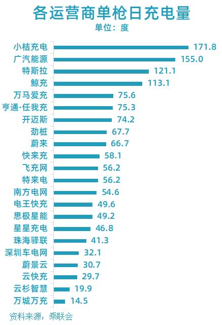 先來(lái)看一組乘聯(lián)會(huì)從中國(guó)充電聯(lián)盟獲取的數(shù)據(jù),其中,各運(yùn)營(yíng)商日單槍充電量最高的,是小桔充電171.8度,其次是廣汽能源155度和特斯拉121.1度。