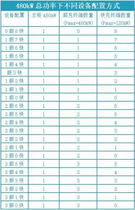 基于以上的條件,該項(xiàng)目為一套總功率為480kW的分體式充電堆,其中充電終端的設(shè)置可以靈活分配,充電模塊的分配顆粒度為60kW,則普通快充終端的配置可以是0-8臺(tái)不等,相對(duì)應(yīng)的超充終端可以為8-0臺(tái)。