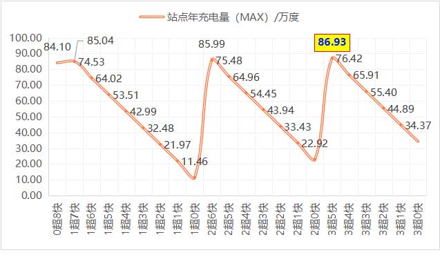 由于充電站的平均時(shí)間利用率不高,假設(shè)站點(diǎn)的效率最大化的情況,那就是每個(gè)充電終端在時(shí)間利用率期間,都能最大功率輸出,互不干擾,那么,充電終端多的配置充電量大,并且配置了更多的超充終端的充電量越大。如圖所示,配置3超5快的配置充電量最大。