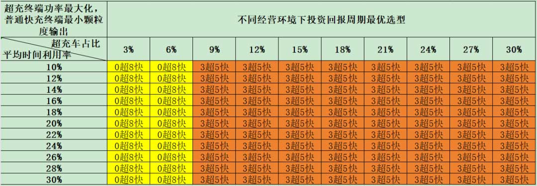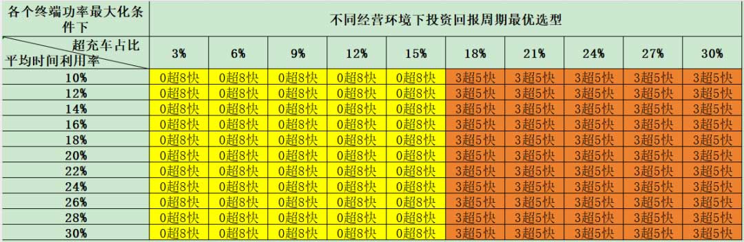 當(dāng)在各個(gè)終端都能夠最大化條件輸出的條件下,設(shè)備選型的臨界點(diǎn)是超充車(chē)輛占比在15%-18%之間。