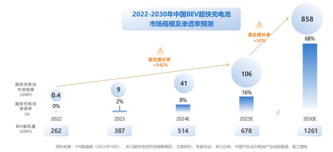 根據(jù)中國(guó)汽車(chē)動(dòng)力電池產(chǎn)業(yè)聯(lián)盟預(yù)測(cè),到2025年,電池裝機(jī)量將超過(guò)678GWh,其中超充電池約106GWh,占比16%,復(fù)合增長(zhǎng)率高達(dá)542%。