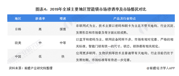 根據(jù)全國鎖具行業(yè)信息中心公布的數(shù)據(jù)顯示,中國市場滲透率目前不及日韓歐美地區(qū),2019年中國智能門鎖滲透率為7%,而韓國滲透率高達(dá)70%,歐美國家滲透率也達(dá)到50%,中國智能門鎖市場滲透率較低,增長空間巨大。目前全球智能鎖主要銷售區(qū)域集中在韓國、日本、歐美及中國等地。從市場滲透率增速來看,中國智能門鎖滲透率增速最快,在公寓、商用居住的細(xì)分市場,中國智能門鎖的滲透率有望趕超日韓。