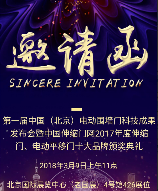 由中國(guó)伸縮門網(wǎng)、中出網(wǎng)、《中國(guó)伸縮門》雜志、《中國(guó)出入口設(shè)備》雜志聯(lián)合主辦的第七屆中國(guó)伸縮門、電動(dòng)平移門十大品牌頒獎(jiǎng)盛典,將于2018年3月9日上午11點(diǎn)在北京國(guó)際展覽中心(老國(guó)展)4號(hào)館426展位舉行。同時(shí)舉辦的還有第一屆中國(guó)(北京)電動(dòng)圍墻門科技成果發(fā)布會(huì)。