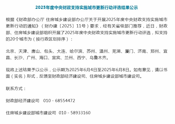 據(jù)財(cái)政部最新消息,根據(jù)《財(cái)政部辦公廳 住房城鄉(xiāng)建設(shè)部辦公廳關(guān)于開展2025年度中央財(cái)政支持實(shí)施城市更新行動(dòng)的通知》(財(cái)辦建〔2025〕11號(hào))要求,經(jīng)有關(guān)省級(jí)部門推薦,近日,財(cái)政部、住房城鄉(xiāng)建設(shè)部組織開展了2025年度中央財(cái)政支持實(shí)施城市更新行動(dòng)評(píng)選,擬支持的20個(gè)城市為(按行政區(qū)劃排序):