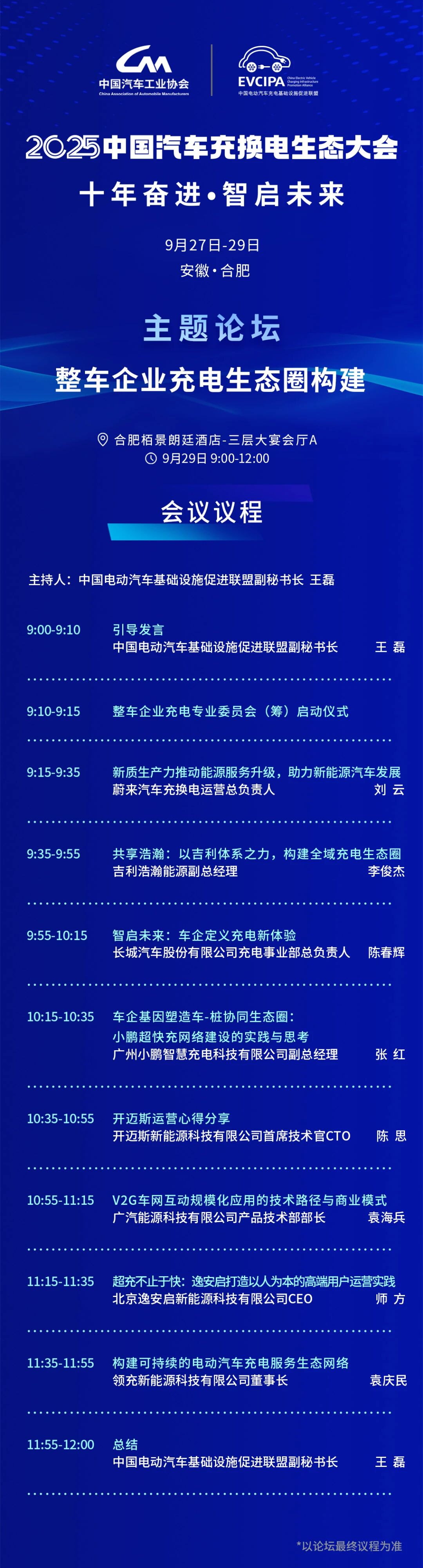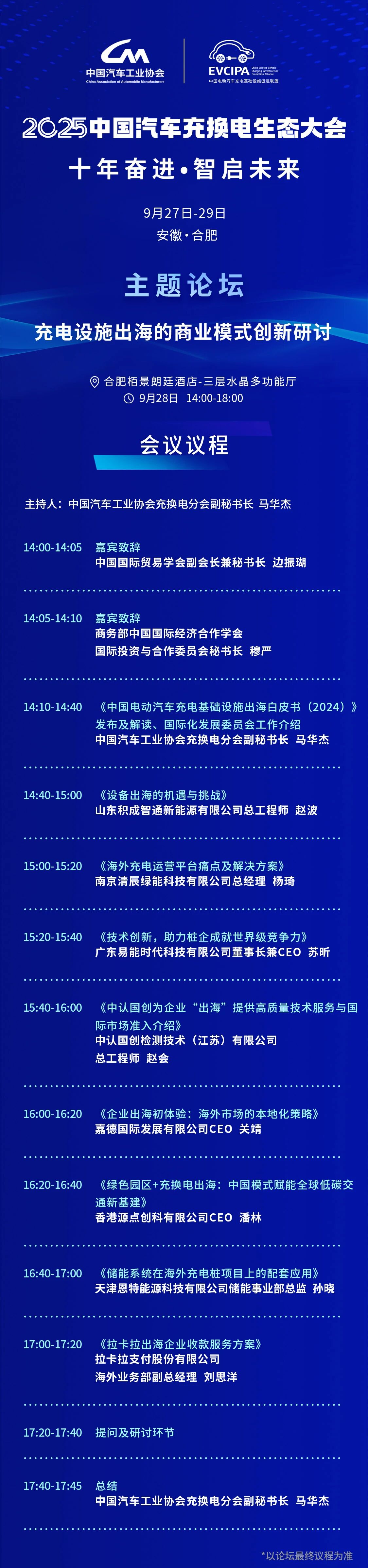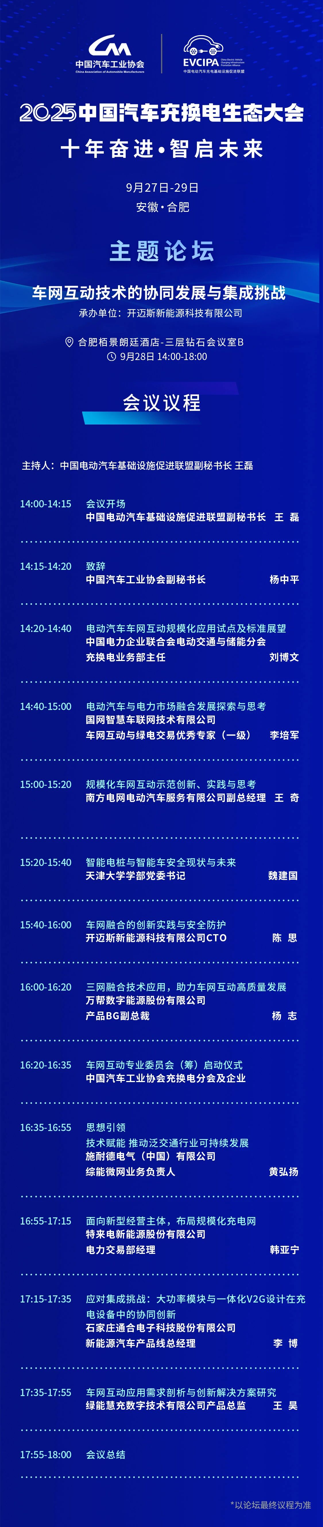 恰逢我國(guó)新能源汽車(chē)充換電行業(yè)發(fā)展十周年之際,由中國(guó)電動(dòng)汽車(chē)充電基礎(chǔ)設(shè)施促進(jìn)聯(lián)盟和中國(guó)汽車(chē)工業(yè)協(xié)會(huì)充換電分會(huì)主辦的“2025中國(guó)汽車(chē)充換電生態(tài)大會(huì)”,將于9月27日-30日在安徽省合肥市舉辦。本次大會(huì)以【十年奮進(jìn),智啟未來(lái)】為主題,設(shè)置一場(chǎng)開(kāi)幕式&大會(huì)論壇,6場(chǎng)主題論壇,多場(chǎng)特色專(zhuān)場(chǎng),以及1場(chǎng)充換電產(chǎn)業(yè)十周年發(fā)展成果回顧及充換電展。