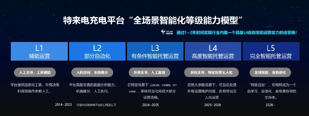 特來(lái)電定義了充電平臺(tái)L1-L5“全場(chǎng)景智能化等級(jí)能力模型”。行業(yè)內(nèi)主流充電平臺(tái)在L2級(jí)及以下,而特來(lái)電通過(guò)借助AI大模型,實(shí)現(xiàn)了L3(有條件智能托管運(yùn)營(yíng)),同時(shí)在新一代充電網(wǎng)數(shù)字化充電平臺(tái)下,通過(guò)1-2年時(shí)間將實(shí)現(xiàn)行業(yè)內(nèi)第一個(gè)具備L4級(jí)別智能運(yùn)營(yíng)能力,為客戶提供通往L5級(jí)無(wú)人值守運(yùn)營(yíng)的最優(yōu)路徑,線下場(chǎng)站全自動(dòng),線上運(yùn)營(yíng)全智能。
