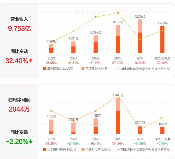 2025年前三季度公司實現(xiàn)營業(yè)總收入9.75億元,同比增長32.40%;歸母凈利潤2043.78萬元,同比下降2.20%;扣非凈利潤1590.94萬元,同比下降9.61%。