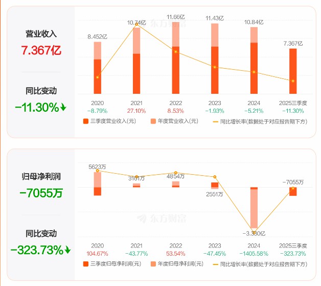 2025年前三季度公司實現(xiàn)營業(yè)總收入7.37億元,同比下降11.30%;歸母凈利潤虧損7054.75萬元,上年同期虧損1664.93萬元。