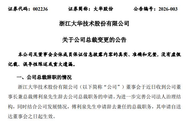 1月5日,大華股份宣布,傅利泉辭去總裁職位。經(jīng)董事長(zhǎng)傅利泉先生提名、公司董事會(huì)提名委員會(huì)任職資格審查通過,公司董事會(huì)同意聘任趙宇寧先生為公司總裁。