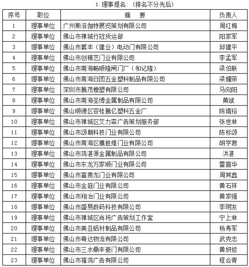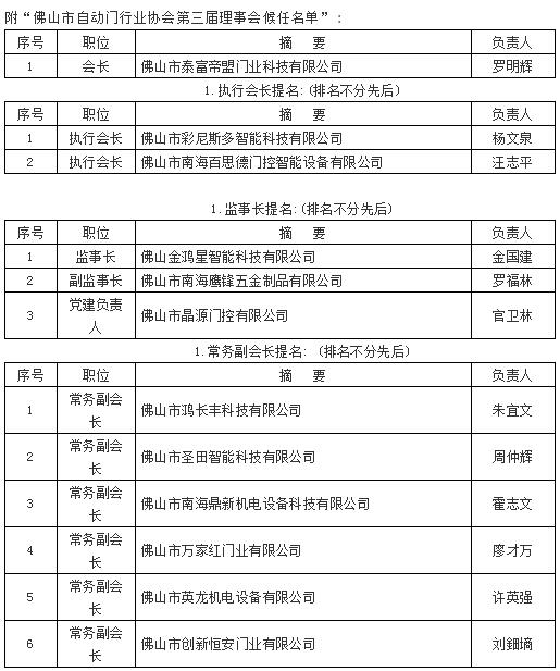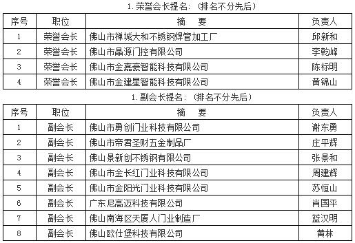 羅明輝先生對(duì)下屆理事會(huì)班子提名:推薦“金嘉豪智能科技有限公司”陳標(biāo)明董事長(zhǎng)擔(dān)任榮譽(yù)會(huì)長(zhǎng);推薦“金建星智能科技有限公司”黃錦山董事長(zhǎng)擔(dān)任榮譽(yù)會(huì)長(zhǎng);推薦“彩尼斯多智能科技有限公司”楊文泉董事長(zhǎng)擔(dān)任執(zhí)行會(huì)長(zhǎng);推薦“百思德門控智能設(shè)備公司”汪志平董事長(zhǎng)擔(dān)任執(zhí)行會(huì)長(zhǎng)(原推薦日?qǐng)F(tuán)五金塑料制品公司梁耀榮董事長(zhǎng)擔(dān)任,梁董因工作繁忙表示謙讓);推薦“金鴻星智能科技公司”金國(guó)建董事長(zhǎng)擔(dān)任監(jiān)事長(zhǎng);推薦“鷹鋒五金制品公司”羅福林董事長(zhǎng)擔(dān)任副監(jiān)事長(zhǎng);推薦“晶源門控公司”官衛(wèi)林總經(jīng)理負(fù)責(zé)協(xié)會(huì)黨建工作;推薦“中國(guó)伸縮門網(wǎng)”程子芬擔(dān)任協(xié)會(huì)副秘書長(zhǎng),協(xié)會(huì)專職秘書長(zhǎng)暫時(shí)空缺;秘書處秘書兼財(cái)務(wù)許少燕繼續(xù)留任;其余常務(wù)副會(huì)長(zhǎng)、副會(huì)長(zhǎng)成員繼續(xù)留任,其余理事會(huì)成員繼續(xù)留任,本屆監(jiān)事任下屆理事,以上提名獲得理事會(huì)鼓掌通過。