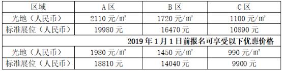 注:標(biāo)準(zhǔn)展位最小租用面積為9㎡ 光地最小租用面積為36㎡。標(biāo)準(zhǔn)展位配置包含展三面圍板、洽談桌一張、椅子兩張、射燈兩盞、中英文雙語(yǔ)楣板一條、220V電源插座一個(gè)(限500W內(nèi)用電);光地不含基本配置。