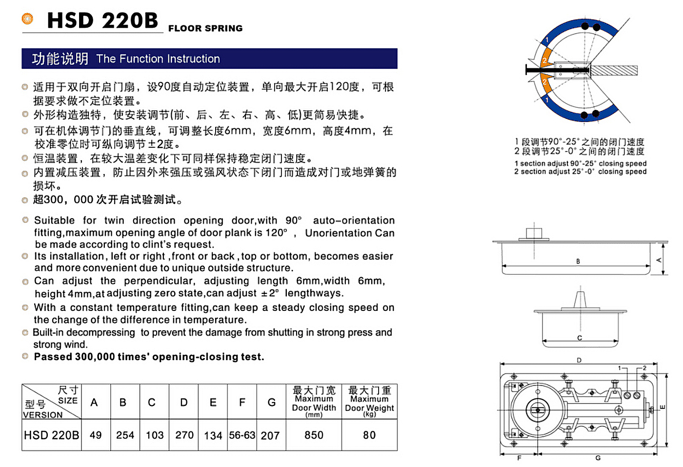 主要特點(diǎn): 適用于雙向開啟門扇,設(shè)90度自動(dòng)定位裝置,單向最大開啟120度,可根據(jù)要求做不定位裝置。
