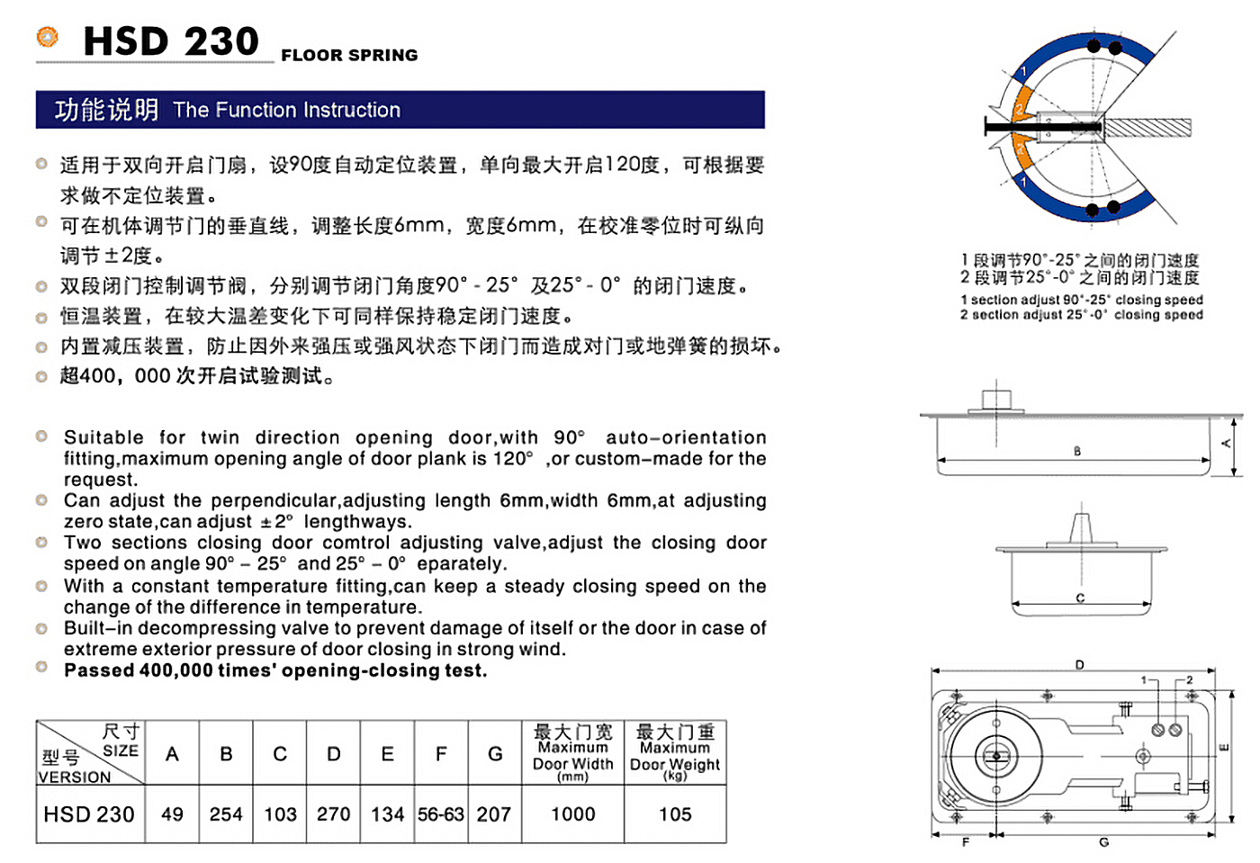 主要特點: 適用于雙向開啟門扇,設(shè)90度自動定位裝置,單向最大開啟120度,可根據(jù)要求做不定位裝置。