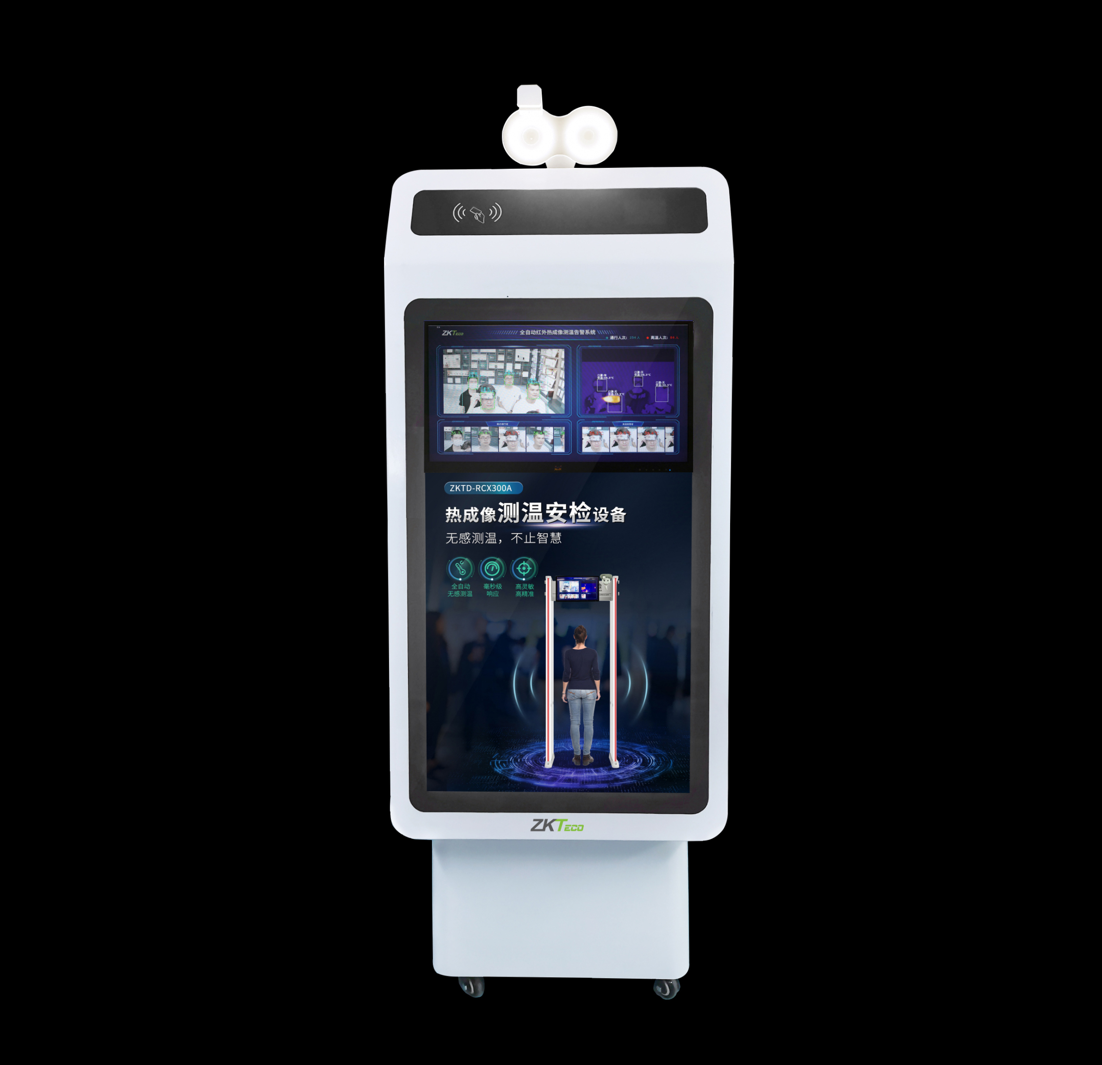智能測溫機器人是一款可移動式熱成像測溫產(chǎn)品,高靈敏度紅外熱成像探頭加上人工智能自動測溫算法,實時自動識別人臉輸出測溫結(jié)果,并可進行口罩佩戴識別,而仿機器人的外觀減少通行人員心理壓力,27寸超大屏幕,既可顯示實時監(jiān)控畫面,顯示測溫結(jié)果,也可播放照片、視頻等信息通知,產(chǎn)品底部配有移動滑輪,可快速便捷的更換使用場所,此外產(chǎn)品可定制增加身份證、健康碼等功能,是目前公共場所需要的測溫產(chǎn)品之一。