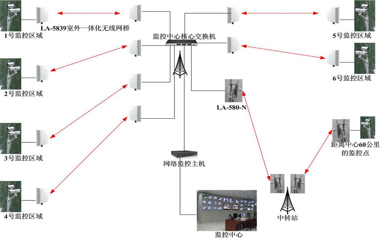 視頻中轉點:考慮到前端各個監(jiān)控點與監(jiān)控中心的不可視性,根據(jù)現(xiàn)場實際情況,整個無線監(jiān)控系統(tǒng)選取了部分無線中繼點,將前端各個點匯聚到各個中繼樓。每個中繼點放置高性能無線網(wǎng)橋設備LA-5810-N外接高增益天線來作為接收,多臺LA-5810-N無線網(wǎng)橋信號通過交換機連接起來,然后再通過LA-5600V6 600M基站型無線網(wǎng)橋用一對一的方式把信號傳輸?shù)椒志直O(jiān)控指揮中心。