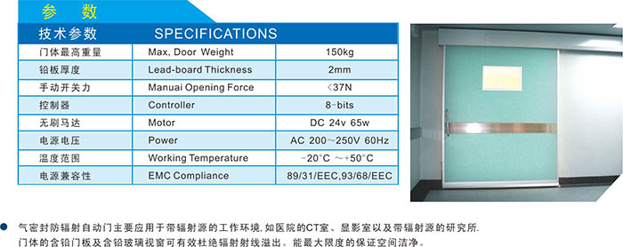 溫馨提醒:選購防輻射自動趟門產(chǎn)品,請仔細瀏覽本頁面。如您還有疑問,請撥打服務電話,我們將免費為您提供防輻射自動趟門的款式、價格、生產(chǎn)廠家、安裝維修等方面的咨詢服務。
