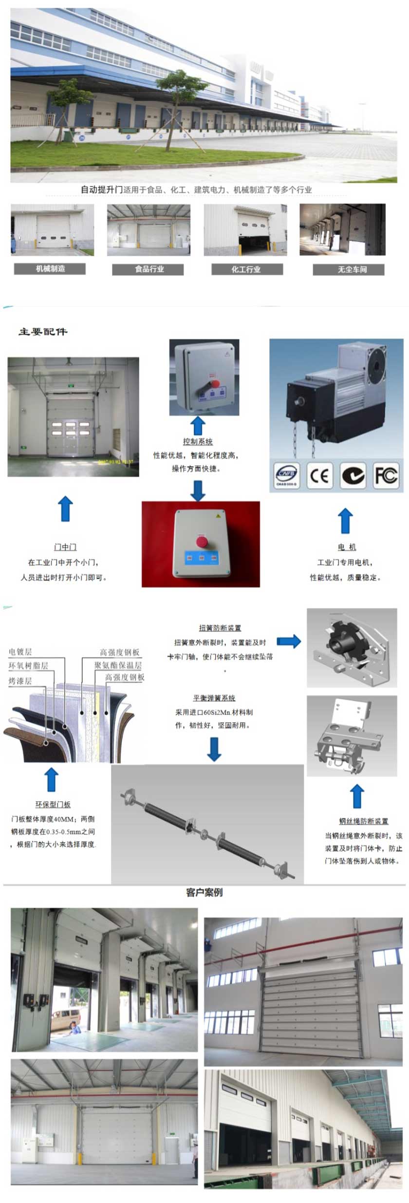 應(yīng)用場(chǎng)所:自動(dòng)提升門(mén)適用于大型倉(cāng)庫(kù)、物流行業(yè)、醫(yī)藥、食品、廠礦企業(yè)等對(duì)于開(kāi)啟速度,保溫,隔音,密封,抗風(fēng)等要求比較高的行業(yè)。尤其是門(mén)洞較大,不便安裝地面門(mén)體的地方起到方便、快捷開(kāi)啟作用。