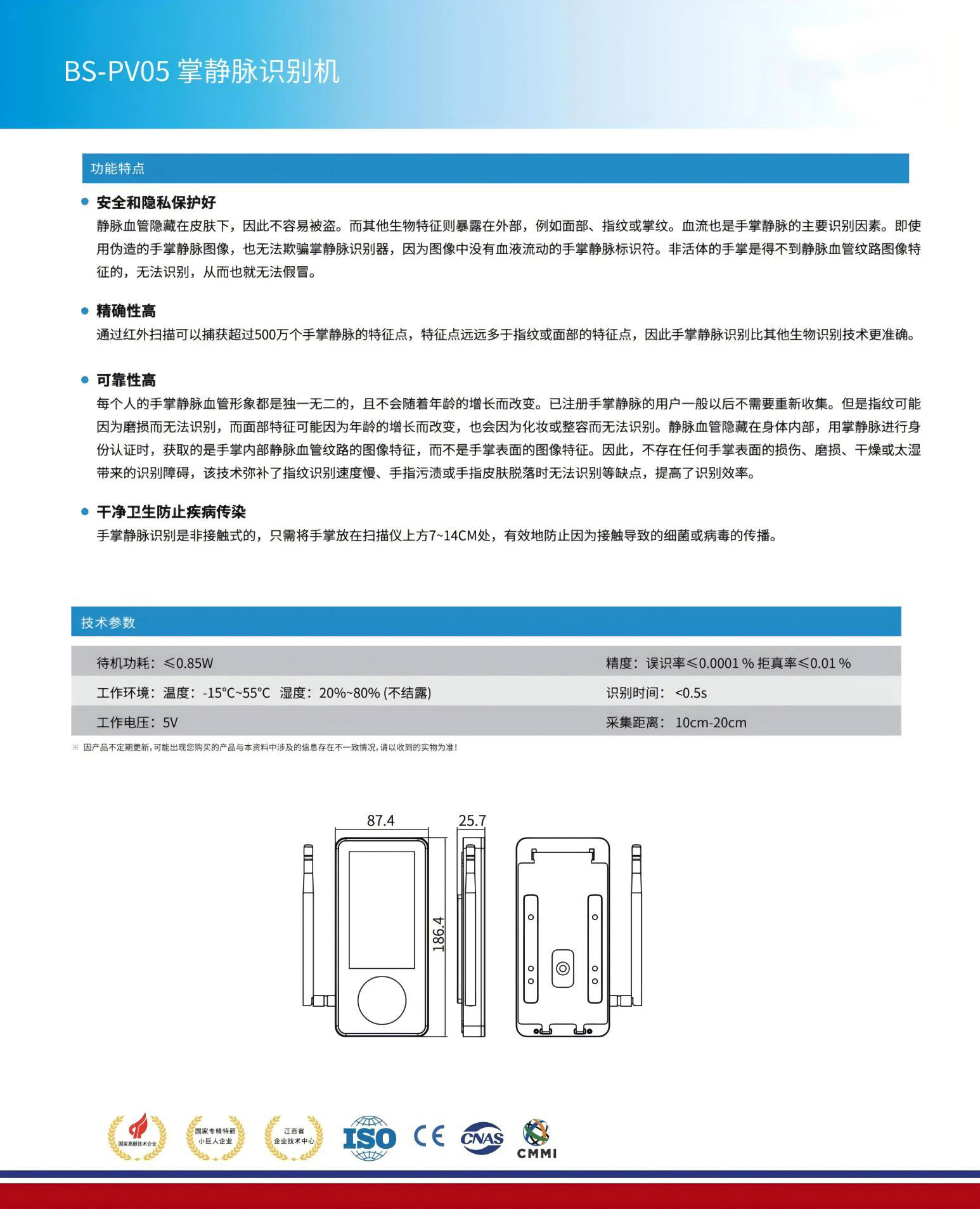 手掌靜脈識別是非接觸式的,只需將手掌放在掃描儀上方7~14CM處,有效地防止因為接觸導(dǎo)致的細(xì)菌或病毒的傳播。