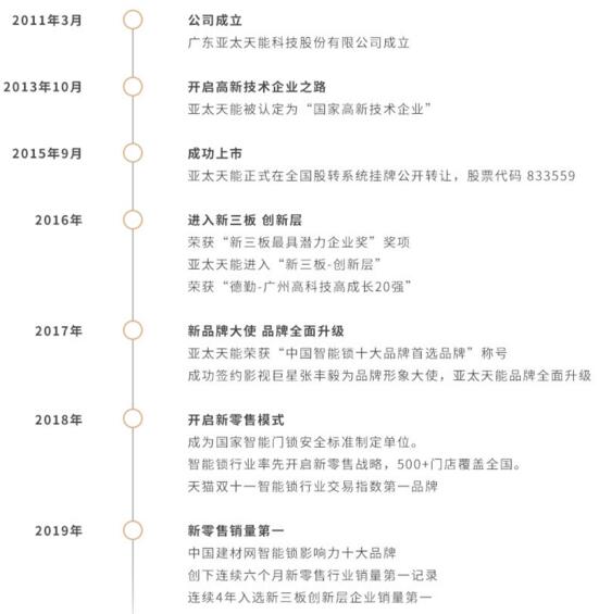 廣東亞太天能科技股份有限公司是中國智能指紋鎖領(lǐng)域領(lǐng)先的產(chǎn)品提供商和解決方案服務(wù)商,同時(shí)也是智能家居領(lǐng)域集科研、設(shè)計(jì)、生產(chǎn)、銷售于一體的專業(yè)化技術(shù)開發(fā)型企業(yè)。公司成立于1991年,注冊資本1.02億,目前旗下?lián)碛衼喬炷苤讣y鎖、晾衣機(jī)兩大系列產(chǎn)品。經(jīng)過多年發(fā)展,亞太天能于2015年正式登陸資本市場新三板,股票代碼833559,是中國首家智能指紋鎖上市公司,并始終穩(wěn)居創(chuàng)新層。