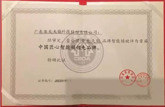 7月8日,亞太天能再次斬獲由中國建筑裝飾協(xié)會頒發(fā)的“ 2019中國匠心智能鎖領(lǐng)先品牌”榮譽(yù)。