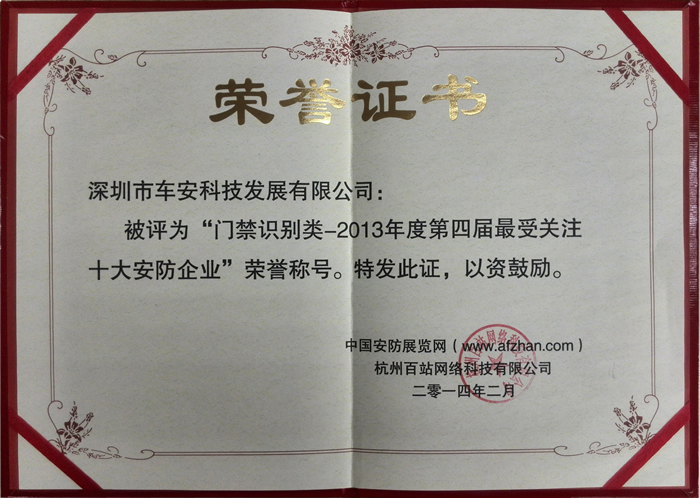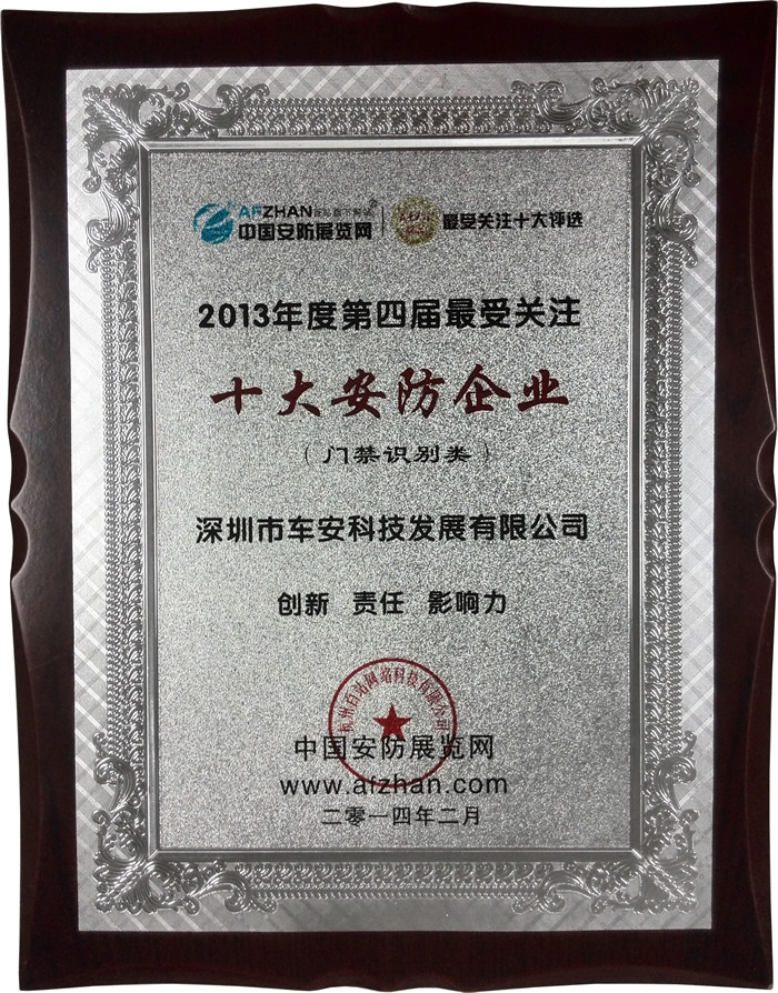 車安科技作為安防一卡通優(yōu)秀供應商及領導者,榮獲“2013年最受關注十大安防企業(yè)”榮譽,車安科技作為《GA/T 761-2008 停車庫(場)安全管理系統(tǒng)技術要求》、《GA/T 992-2012 停車庫(場)出入口控制設備技術要求》等國家停車場行業(yè)標準制訂企業(yè),繼續(xù)專注于安防一卡通產(chǎn)品創(chuàng)新。車安一直堅持“以科技為動力,以質(zhì)量求發(fā)展”的質(zhì)量方針,奉行“科技創(chuàng)新、信譽第一、顧客至上”的經(jīng)營方針,樹立“預防為主,安全生產(chǎn);以人為本,健康生活;遵紀守法,持續(xù)改進”的職業(yè)健康安全方針。注重建立專業(yè)品牌,不斷完善產(chǎn)品售后服務體系,設立24小時服務熱線,隨時隨地竭誠為廣大用戶服務。把創(chuàng)立具有國際競爭力的中國品牌作為己任,處處以最高標準要求自己,由此贏得了廣大用戶的贊譽,不斷擴大在中國停車場智能化領域的影響力,并逐漸發(fā)展壯大成為領航中國安防行業(yè)的龍頭企業(yè)。