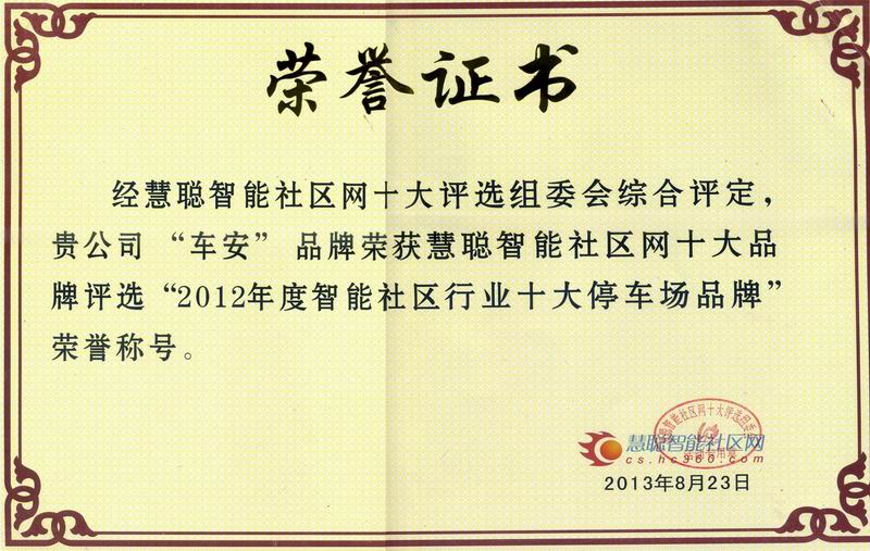 車安科技在本屆評(píng)選中,因得到了網(wǎng)友、買家和專家的廣泛認(rèn)可與支持而名列前茅,最終獲得殊榮,再度榮膺“慧聰網(wǎng)2012年度中國智能社區(qū)十大停車場品牌獎(jiǎng)項(xiàng)”,可謂實(shí)至名歸!
