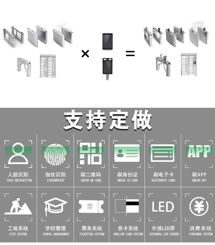 一般由兩臺機箱組成一個通道,通道寬0.55米左右,可以根據(jù)需求定制,適用于入口和出口處,用于單向或雙向通行人員控控制,通行速度快,提升通行效率。主要用于人多且高頻率進出場合,比如地鐵、高鐵等軌道交通場合和日人員流動交高的景區(qū),具有快速打開關(guān)閉、安全、方便等特點,也是寫字樓大廈、智慧園區(qū)入口選擇較多的類型。