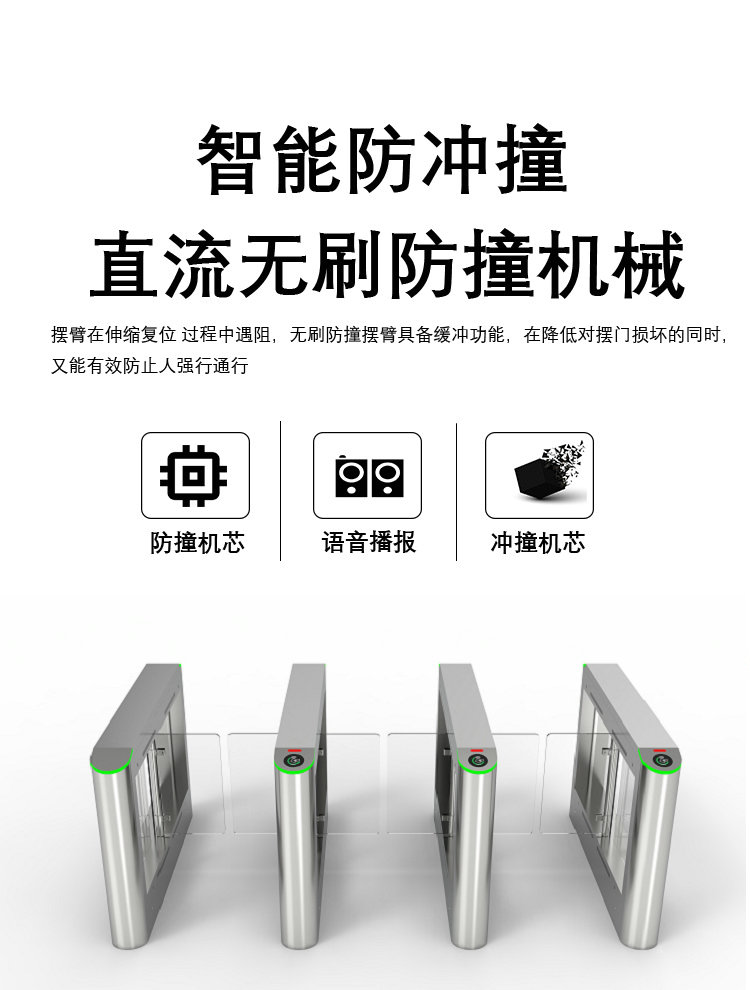 機械防撞設(shè)計:閘擺采用柔性材料(如聚氨酯)或彈性結(jié)構(gòu),受到外力撞擊時可緩沖卸力,減少設(shè)備損壞和行人受傷風(fēng)險。
