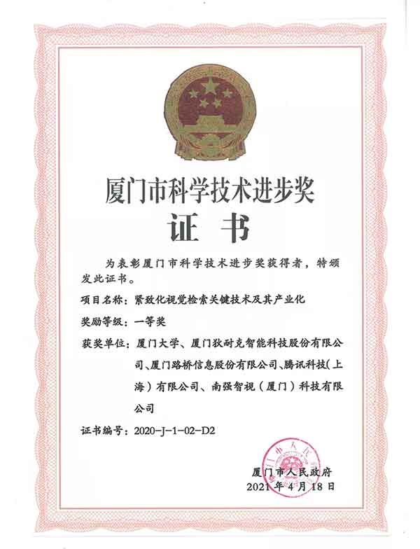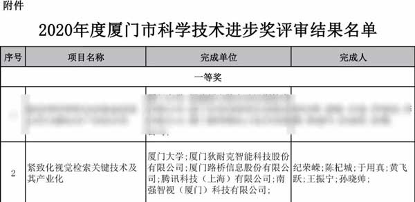 "緊致化視覺檢索關鍵技術"項目榮獲“2020年度廈門市科學技術進步一等獎”。該獲獎項目由廈門大學與廈門狄耐克智能科技股份有限公司、廈門路橋信息股份有限公司、騰訊科技(上海)有限公司、南強智視(廈門)科技有限公司等單位共同完成。