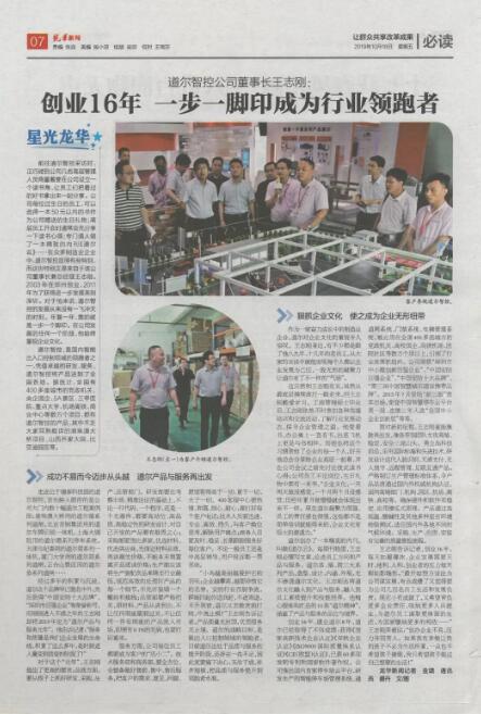 記者金璐多次深入道爾智控全面采訪,為王總16年篳路藍(lán)縷、艱苦創(chuàng)業(yè)所感動(dòng),為道爾智控以工匠精神打造一流產(chǎn)品、潛心客戶服務(wù)所贊賞。專(zhuān)訪以整版篇幅、配高清圖片,報(bào)道了王總帶領(lǐng)公司員工,“成功不易,而今邁步從頭越,道爾產(chǎn)品與服務(wù)再出發(fā)”;“狠抓企業(yè)文化,使之成為企業(yè)紐帶”。