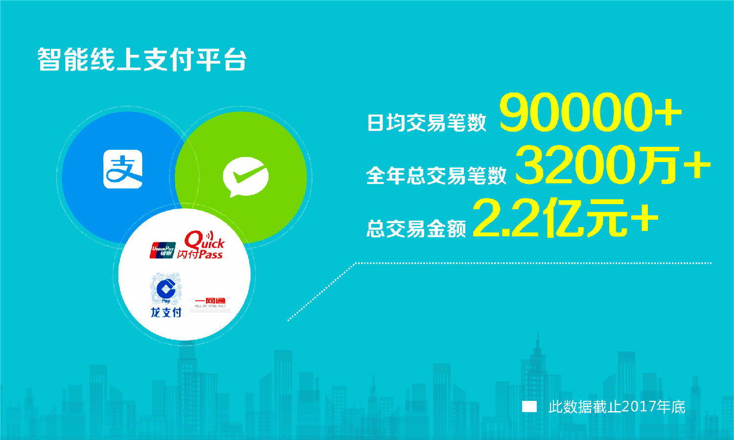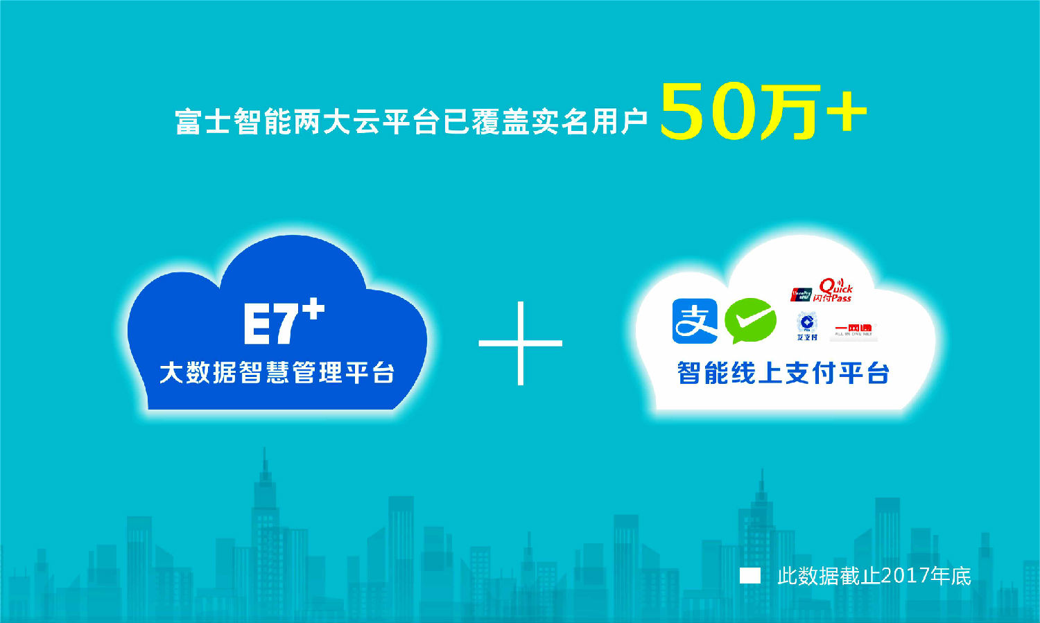 截至2017年底,兩大云平臺已覆蓋實名用戶50萬+,其中“E7+云平臺”已累計覆蓋全國25個省份及直轄市的500多個停車項目,車道數(shù)突破2500+;“線上支付云平臺”日均交易量達9萬余筆,全年總交易量超過3200萬筆,總交易金額突破2.2億元。兩大云平臺已成為富士智能的核心競爭優(yōu)勢,有力提升了富士智能的市場競爭力。