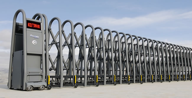 伸縮門就是門體可以伸縮自由移動(dòng),來(lái)控制門洞大小、來(lái)控制行人或車輛的攔截和放行的一種門。伸縮門主要由門體、驅(qū)動(dòng)電機(jī),滑道、控制系統(tǒng)構(gòu)成。門體采用優(yōu)質(zhì)不銹鋼及鋁合金專用型材制作,采用平行四邊形原理鉸接,伸縮靈活行程大。驅(qū)動(dòng)器采用特種電機(jī)驅(qū)動(dòng),蝸桿蝸輪減速,并設(shè)有自動(dòng)離合或手動(dòng)離合器,自動(dòng)離合停電時(shí)可自動(dòng)啟閉,手動(dòng)離合停電時(shí)可手動(dòng)啟閉,控制系統(tǒng)有控制板,按鈕開關(guān),另可根據(jù)需求配備無(wú)線遙控裝置。