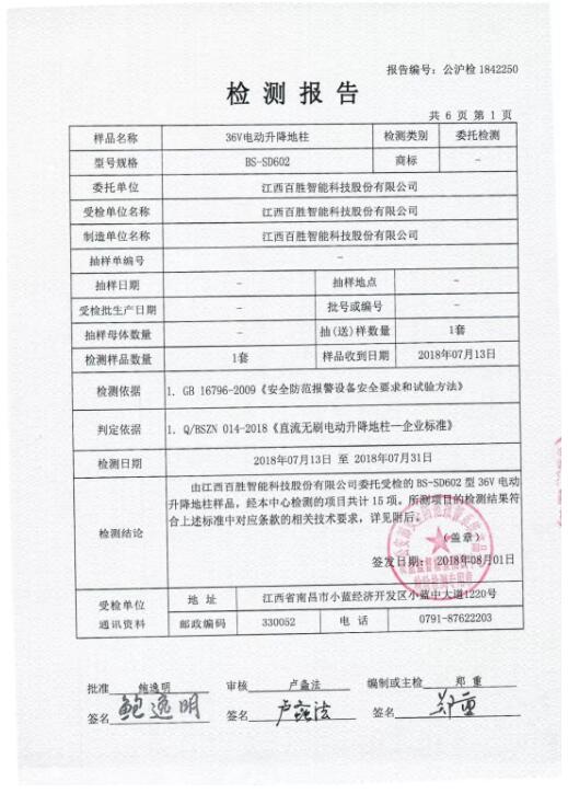 在公安三所的權(quán)威檢驗下,百勝36V直流無刷升降地柱符合“GB 16796-2009《安全防范報警設(shè)備安全要求和試驗方法》及Q/BSZN 014-2018《直流無刷電動升降地柱-企業(yè)標(biāo)準(zhǔn)》”要求。