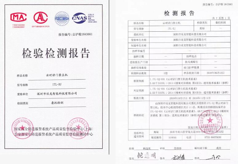 檢測(cè)結(jié)果1:由本中心抽樣,深圳市旺龍智能科技有限公司委托并受檢的ITL-DJ型云對(duì)講門禁主機(jī)樣品,經(jīng)本中心檢測(cè)的項(xiàng)目共計(jì)31項(xiàng)。所檢項(xiàng)目的檢測(cè)結(jié)果符合GA/T394.2002《 出入口控制系統(tǒng)技術(shù)要求》的相關(guān)要求。