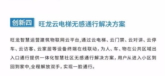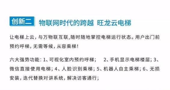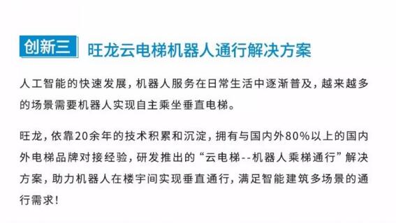 從刷卡電梯發(fā)明企業(yè)到云電梯發(fā)明企業(yè)、機(jī)器人乘梯發(fā)明企業(yè),旺龍一直致力于技術(shù)與產(chǎn)品的研發(fā)創(chuàng)新,為客戶創(chuàng)造價(jià)值,為用戶全面構(gòu)建智慧生活。截止目前,旺龍?jiān)谌珖鴵碛?萬余社區(qū)、6千萬余用戶穩(wěn)定運(yùn)行。2019年,旺龍重磅推出四大創(chuàng)新產(chǎn)品與解決方案: